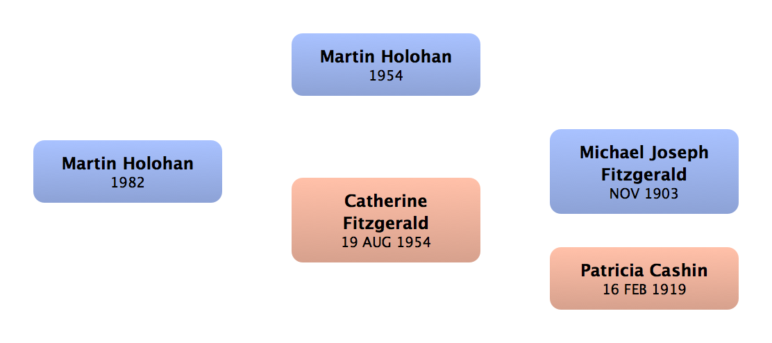 Martin Fitzgerald | 1st cousin once removed up (m) | | Shangan, Co. Waterford, Ireland | | |