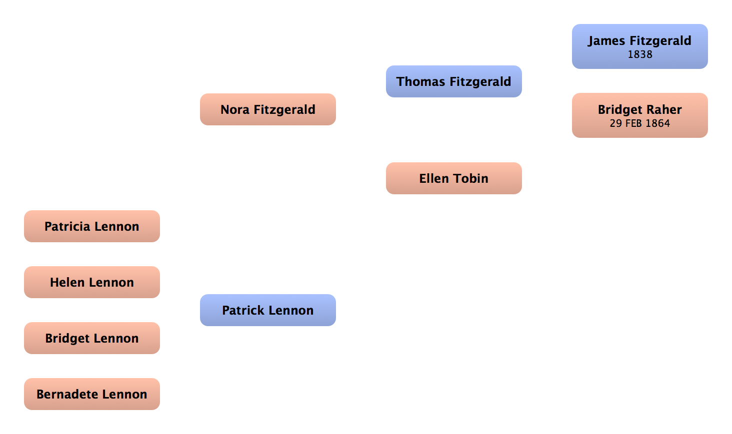 Eileen Fitzgerald | 1st cousin once removed (f) | | Shangon, Co. Waterford, Ireland | | |
