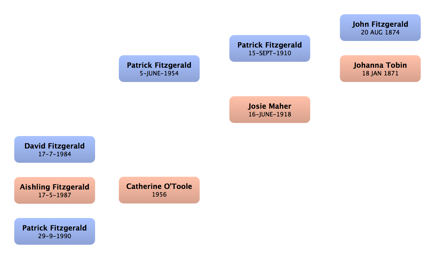 John Fitzgerald | First cousin (m) | | Shangan, Co. Waterford, Ireland | 1974 | London, England |