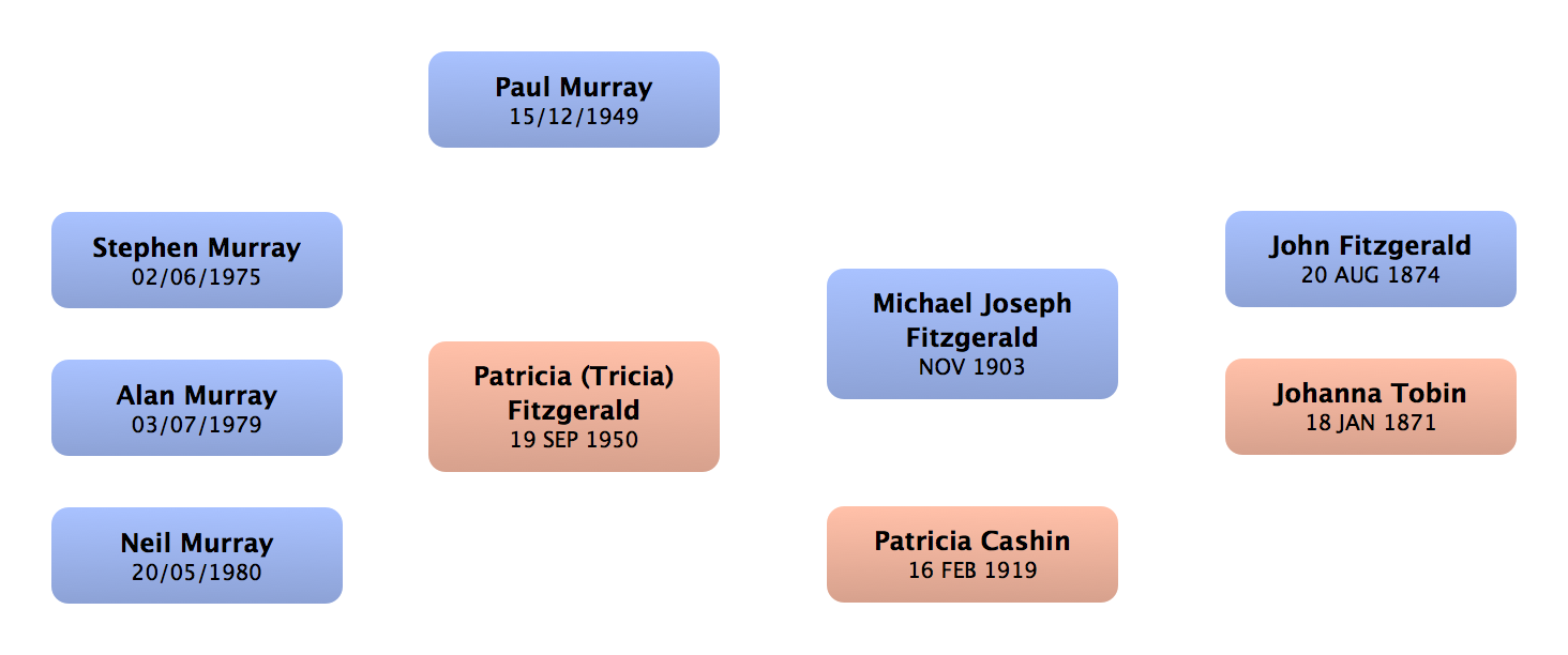 | Mother-in-law | 16 FEB 1919 | Clonmel, Co Tiperary, Ireland | 26 JUN 1986 | Dublin, Ireland | |