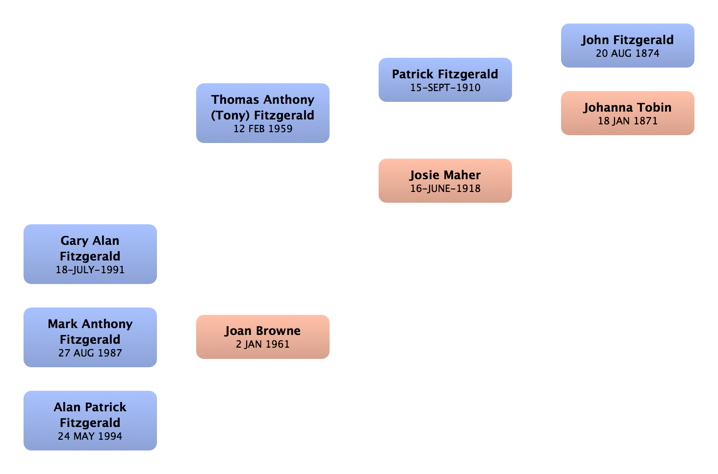 John Fitzgerald | First cousin (m) | | Shangan, Co. Waterford, Ireland | 1974 | London, England |