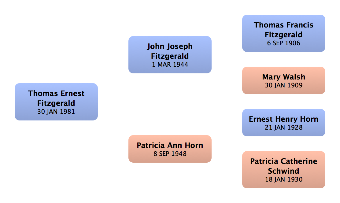 Seamus Fitzgerald | 1st cousin once removed up (m) | | Shangan, Co. Waterford, Ireland | | |