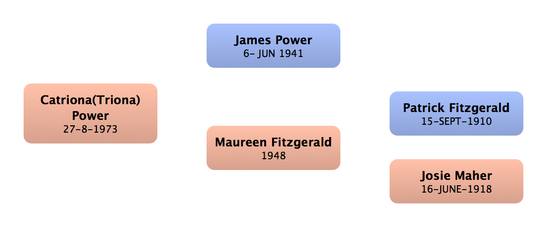 Gerldine Fitzgerald | 1st cousin once removed up (f) | 1949 | Shangan, Co. Waterford, Ireland | | |