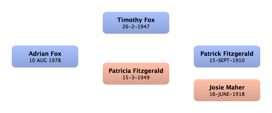 John Fitzgerald | 1st cousin once removed up (m) | | Shangan, Co. Waterford, Ireland | 1974 | London, England |