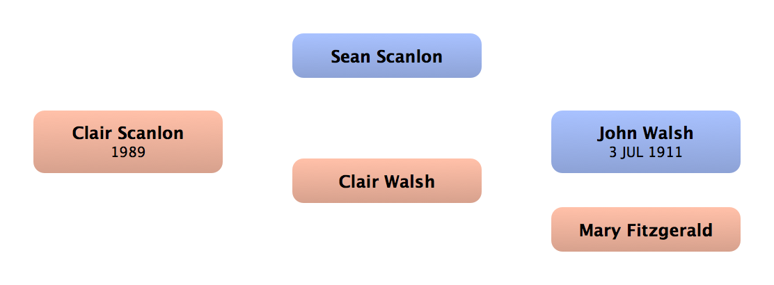John Fitzgerald | 1st cousin once removed up (m) | | Shangan, Co. Waterford, Ireland | 1974 | London, England |