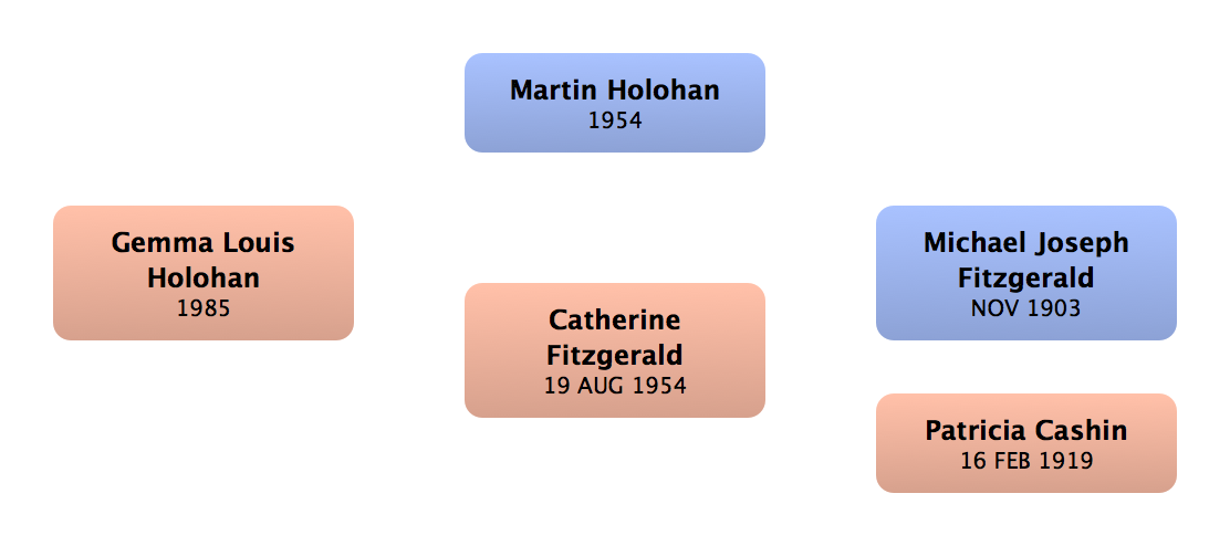Gerldine Fitzgerald | 1st cousin once removed up (f) | 1949 | Shangan, Co. Waterford, Ireland | | |