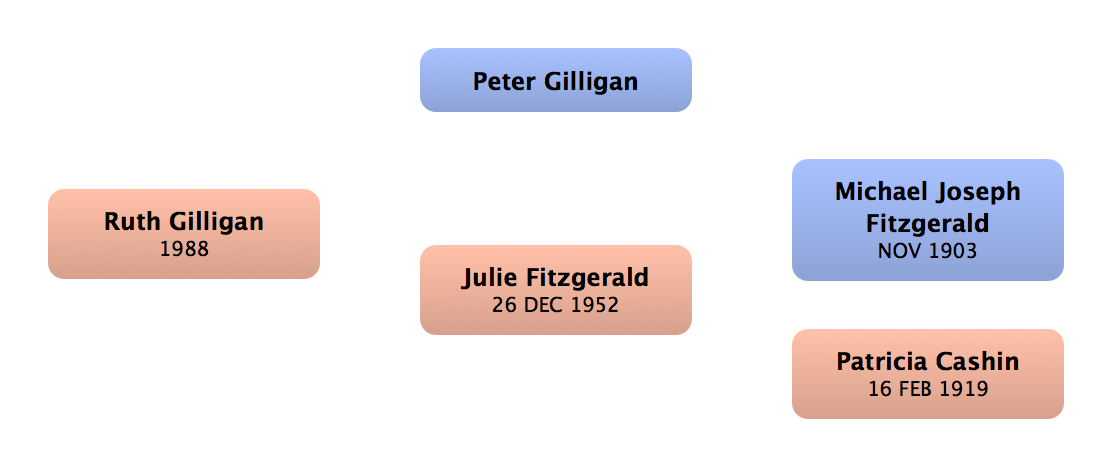 Gerldine Fitzgerald | 1st cousin once removed up (f) | 1949 | Shangan, Co. Waterford, Ireland | | |