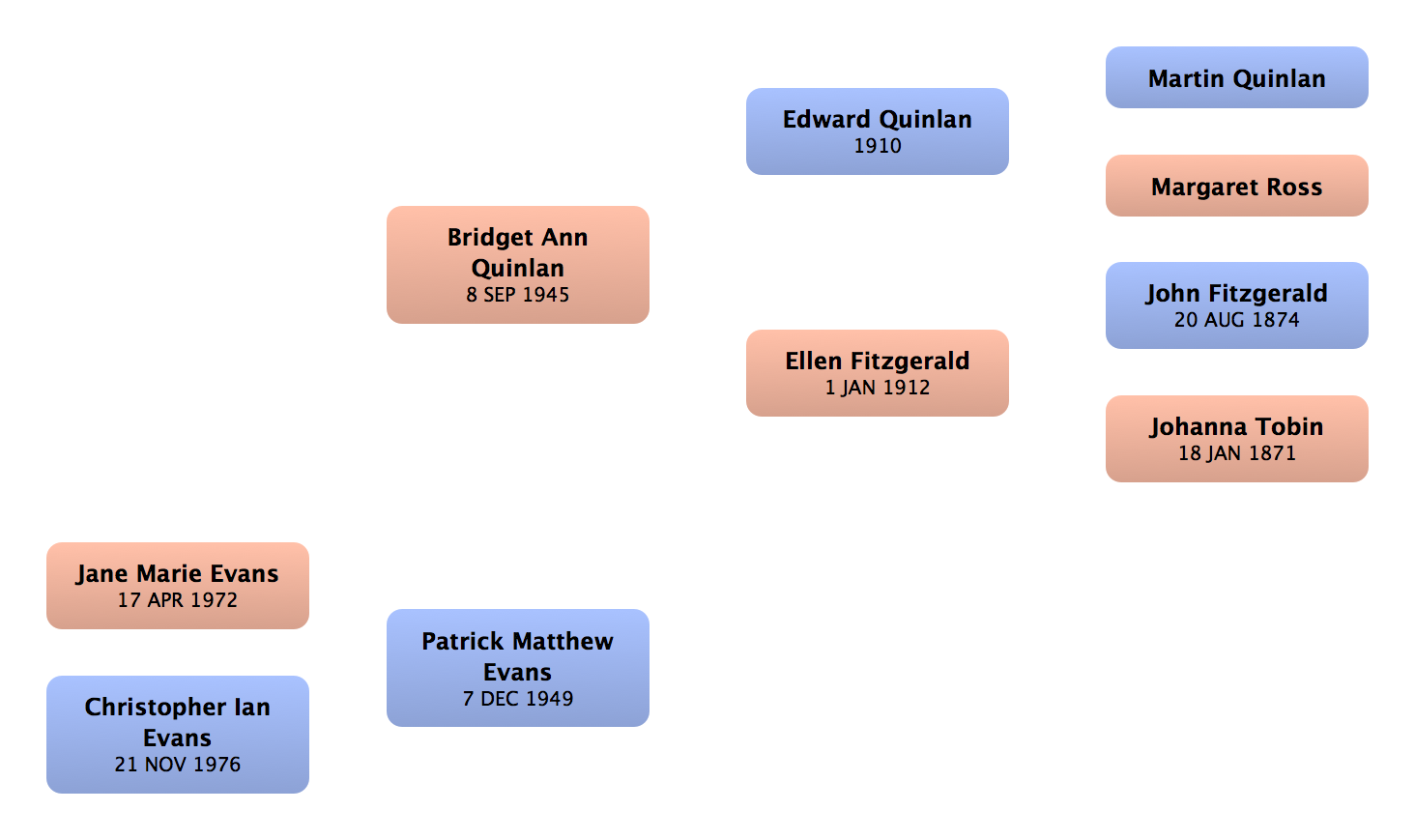 John Fitzgerald | First cousin (m) | | Shangan, Co. Waterford, Ireland | 1974 | London, England |
