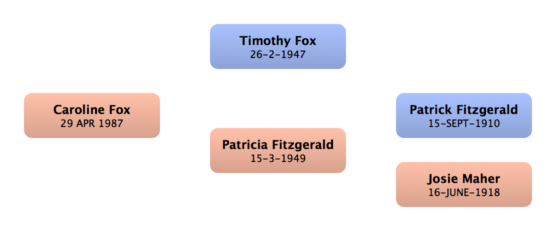 John Fitzgerald | 1st cousin once removed up (m) | | Shangan, Co. Waterford, Ireland | 1974 | London, England |