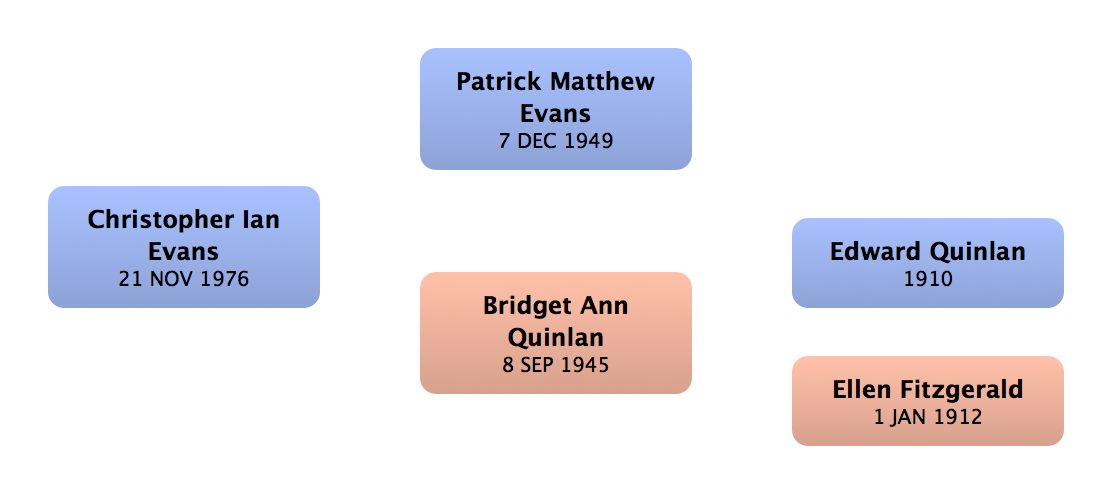 John Fitzgerald | 1st cousin once removed up (m) | | Shangan, Co. Waterford, Ireland | 1974 | London, England |