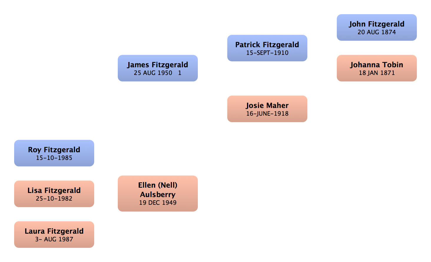 Biddy Fitzgerald | 1st cousin once removed up (f) | | | | (Lived in England) |